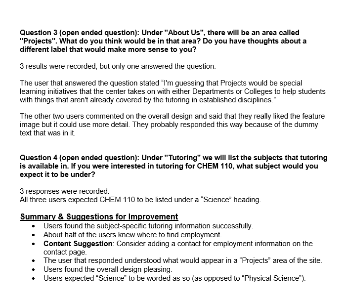 Penn State Learning requested a completely website redesign, including new information architecture and design. I was responsible for creating the new IA, a set of wireframes and also doing a usability test using Verify. The usability test consisted of a short survey with two open ended questions and 2 click tracking questions. At the conclusion of the test I analyzed the results and provided a set of recommendations. Below is the last page of the usability test results report that I created.